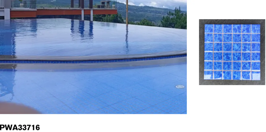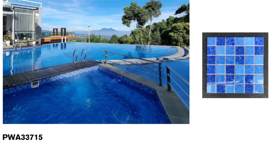 Berbeda dengan tipe sebelumnya, PWA33716 menonjolkan warna biru cerah yang seragam. Gradasi warnanya lebih lembut dan konsisten sehingga menciptakan kesan bersih, segar, dan luas. Keramik ini sangat cocok untuk konsep kolam renang infinity pool yang menyatu dengan pemandangan sekitar. Pantulan langit di permukaan air akan terlihat semakin menawan berkat kilau biru cerah dari keramik ini.